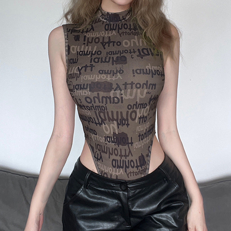 Retro Wind Old Newspaper Letters Printed Sleeveless Thin Jumpsuit Street Hot Girl Slim Bottoming Tank Top