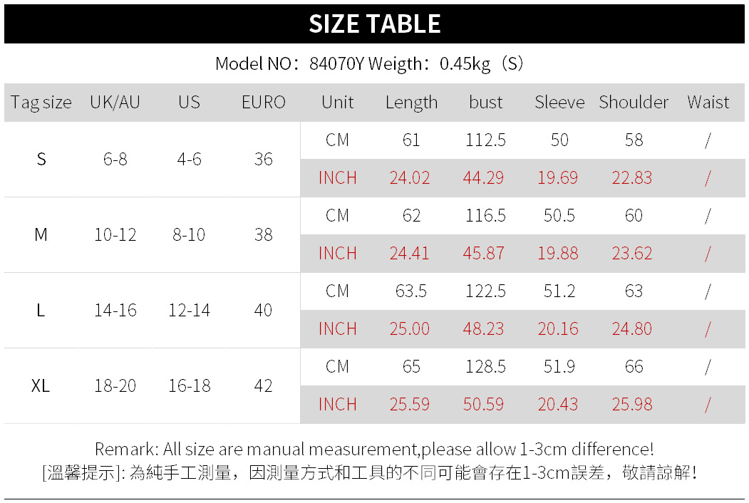 1. Asian sizes are 1 to 2 sizes smaller than European and American people. Choose the larger size if your size between two sizes. Please allow 2-3cm differences due to manual measurement. 2. Please check the size chart carefully before you buy the item, if you don't know how to choose size, please contact our customer service. 3.As you know, the different computers display colors differently, the color of the actual item may vary slightly from the following images.