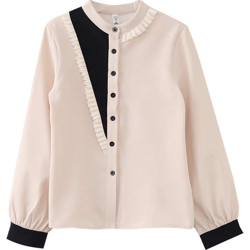 Elegant Two-Tone Ruffled Blouse - Beige & Black Korean style contrast lace long sleeve top