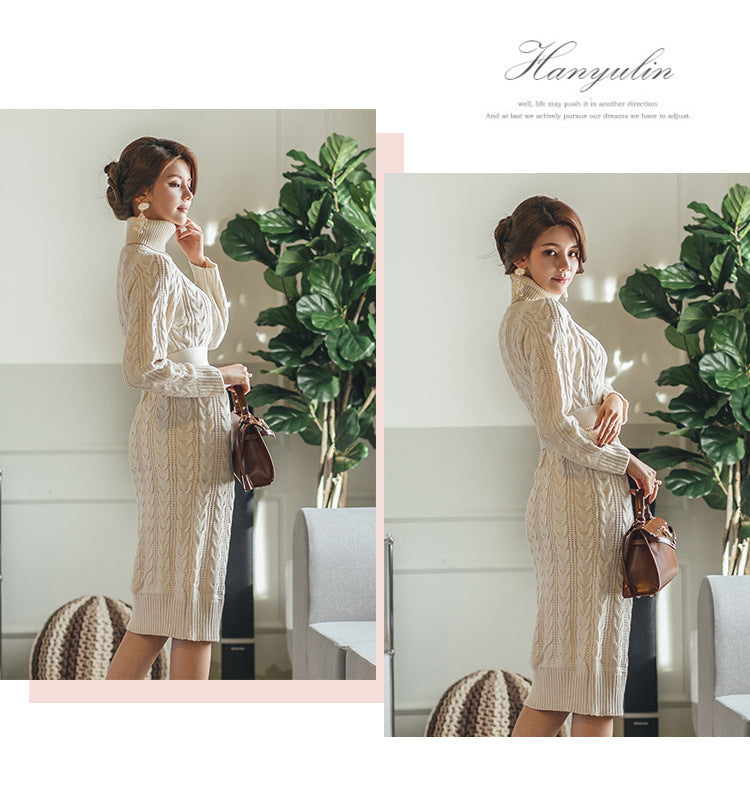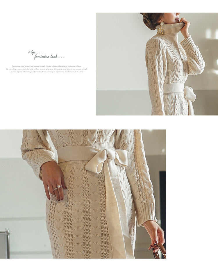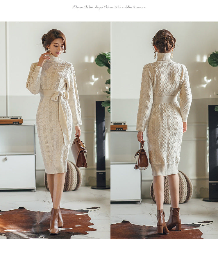 High Collar Twist Lace-up Waist Mid-length Sweater Dress