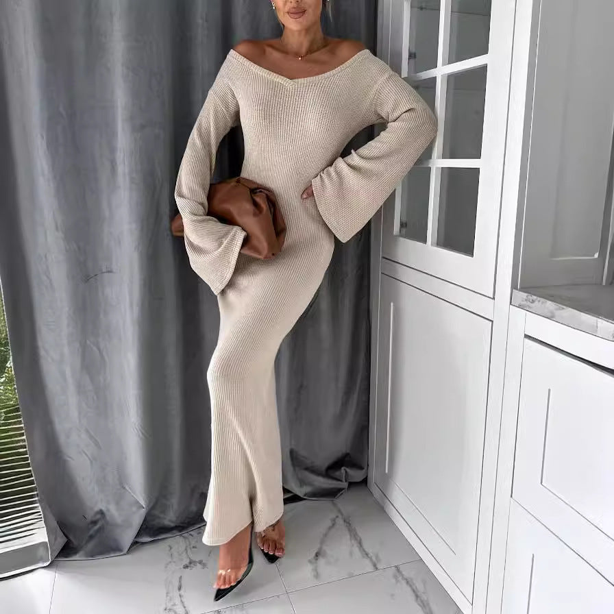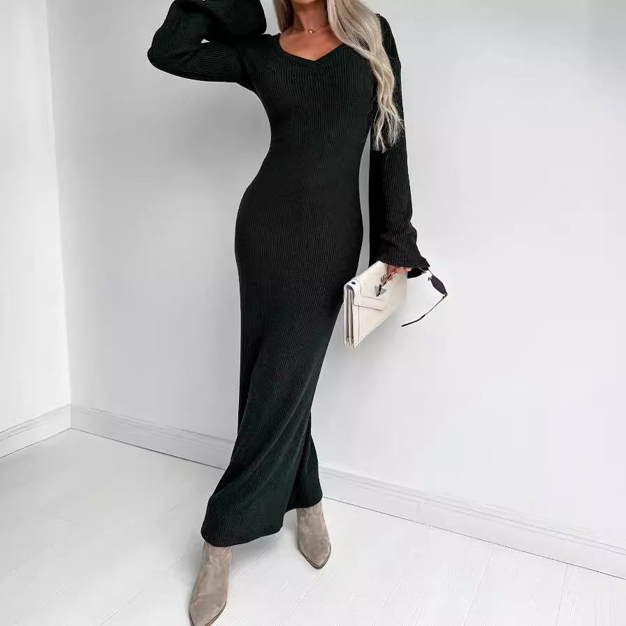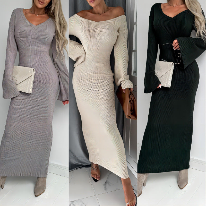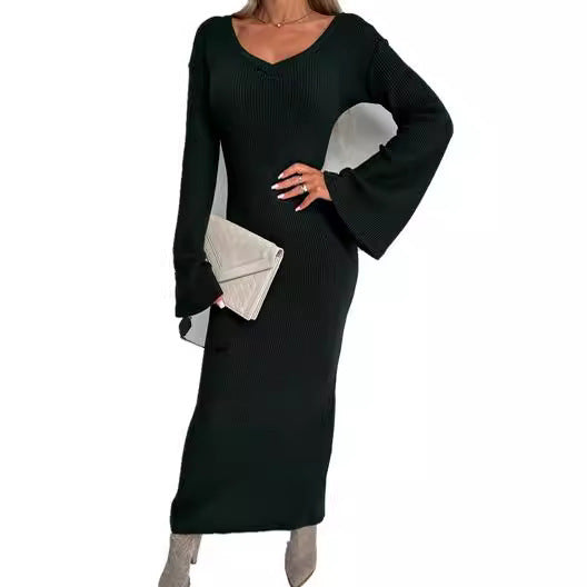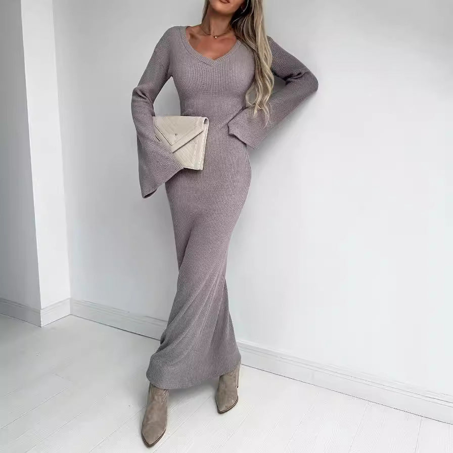 Knitted V-neck Long Sleeve Thick Dress Women