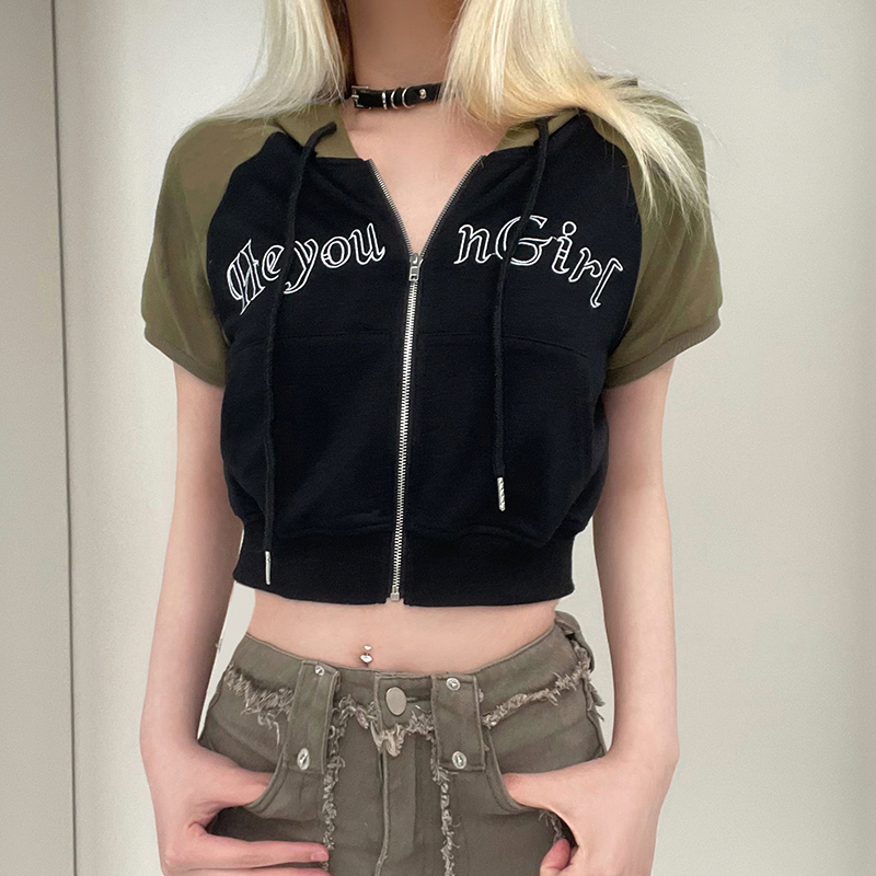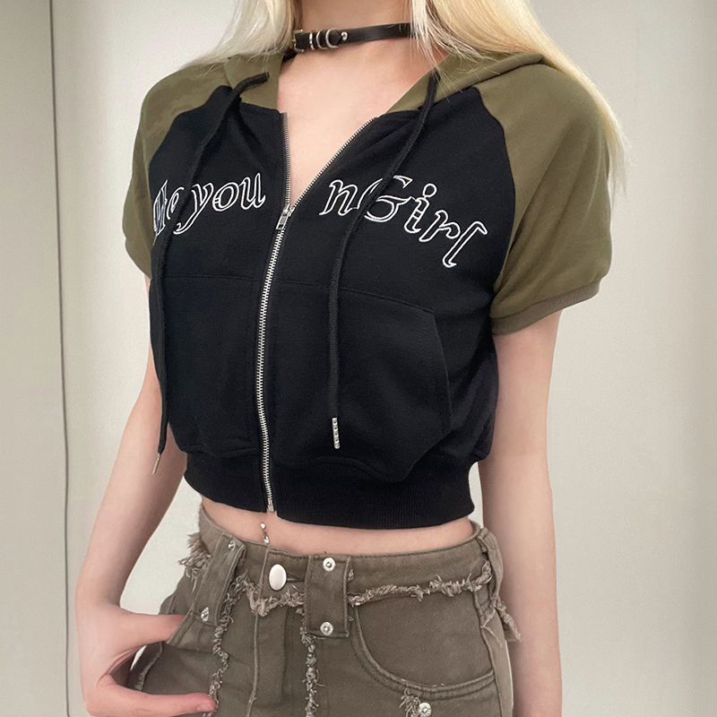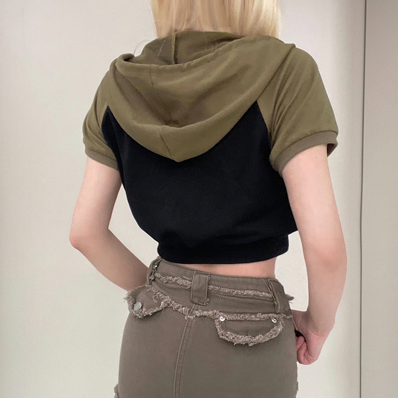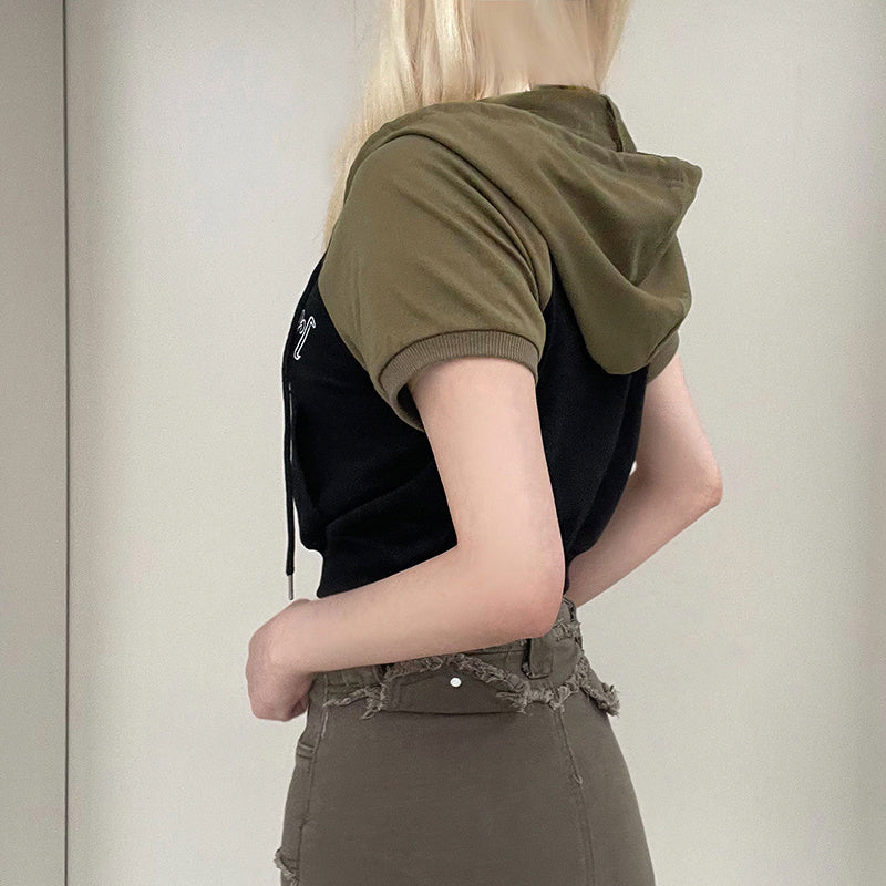 Raglan Contrast Short Sleeve Hoodie Versatile Top