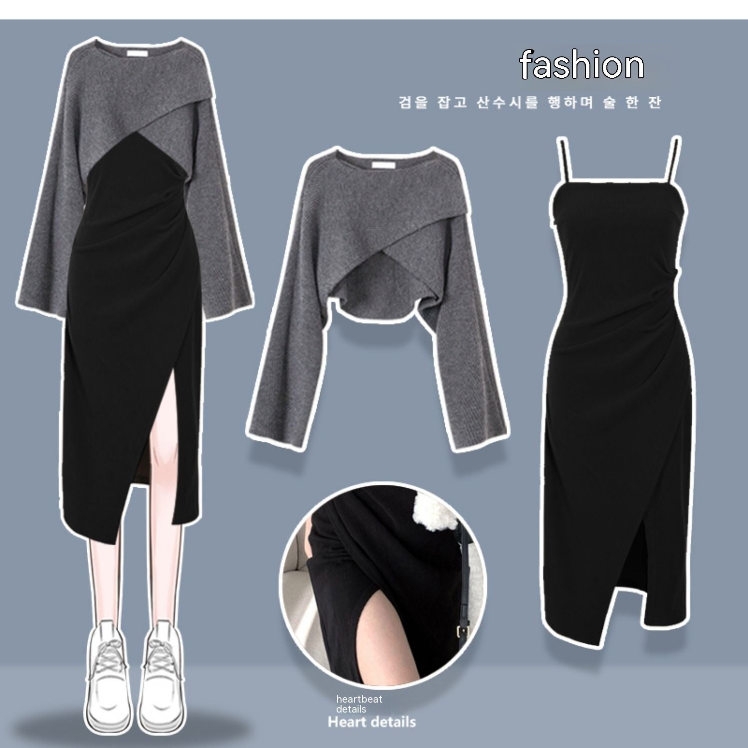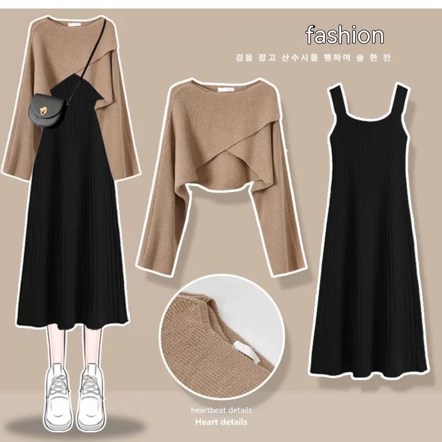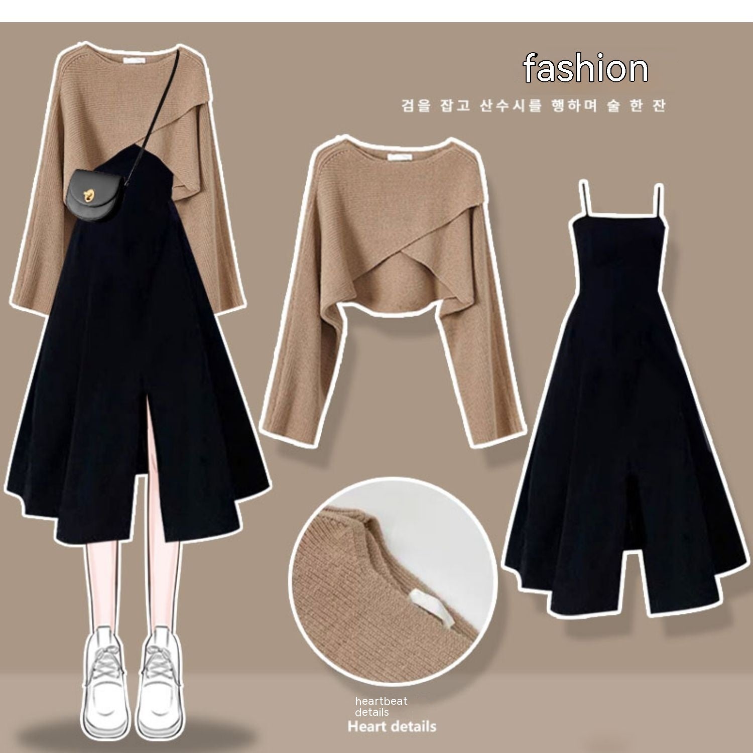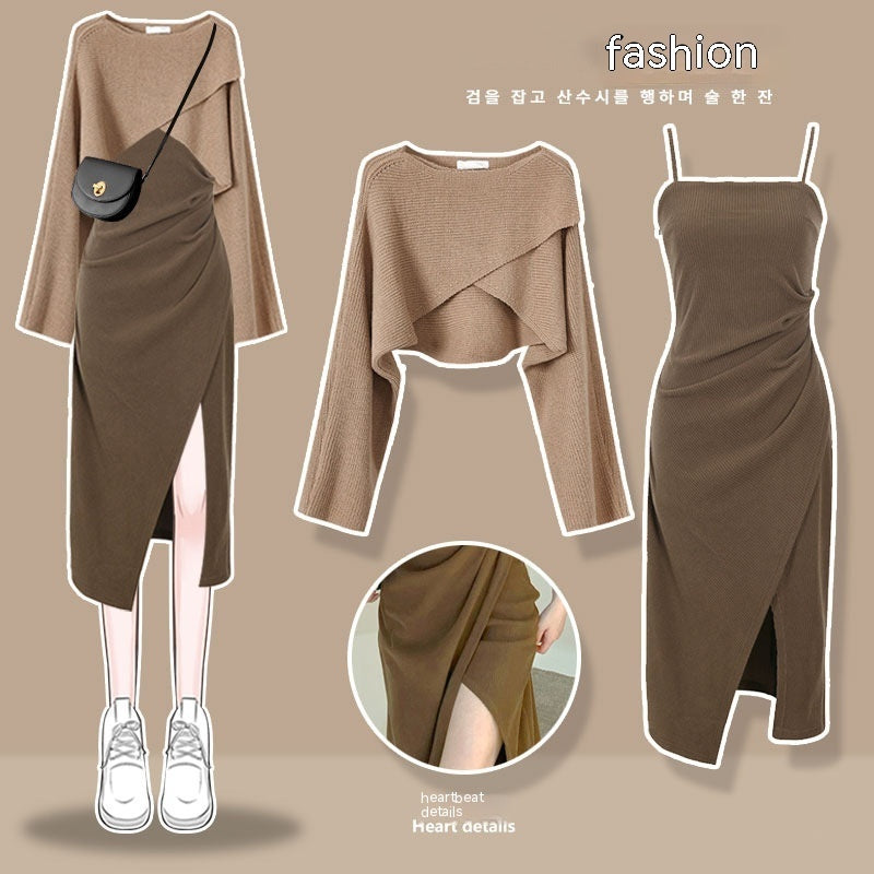 Color:Suit 1: gray sweater Brown suspender skirt two-piece set,Suit 2: gray sweater black slip dress two-piece set,Suit 3: khaki knitwear coffee suspender skirt two-piece set,Suit 4: khaki sweater black non-slip dress two-piece set