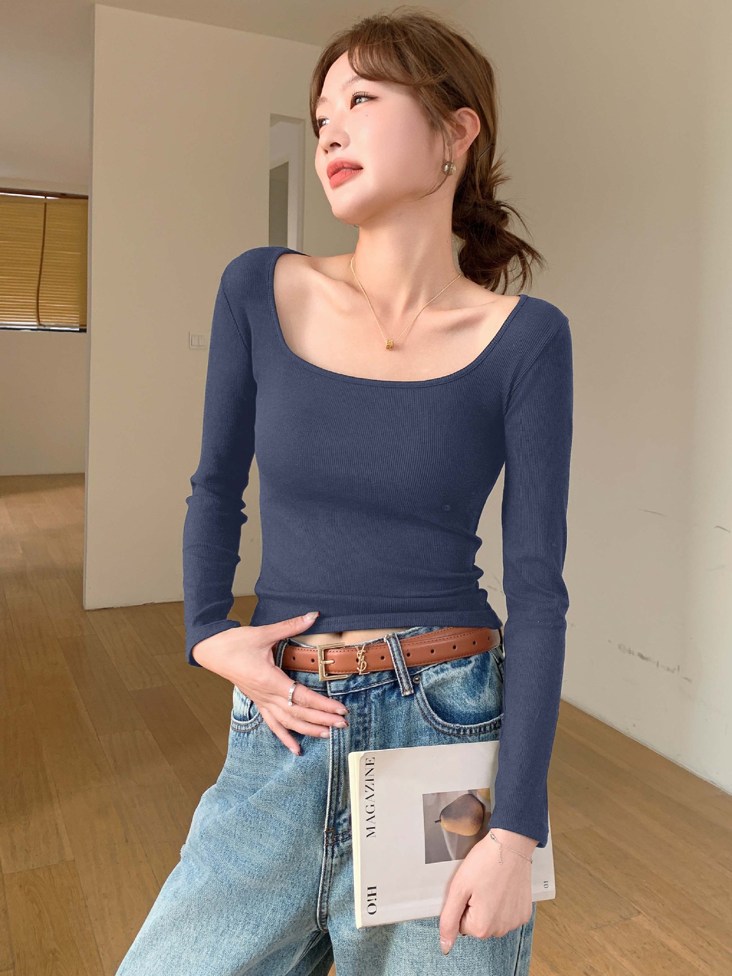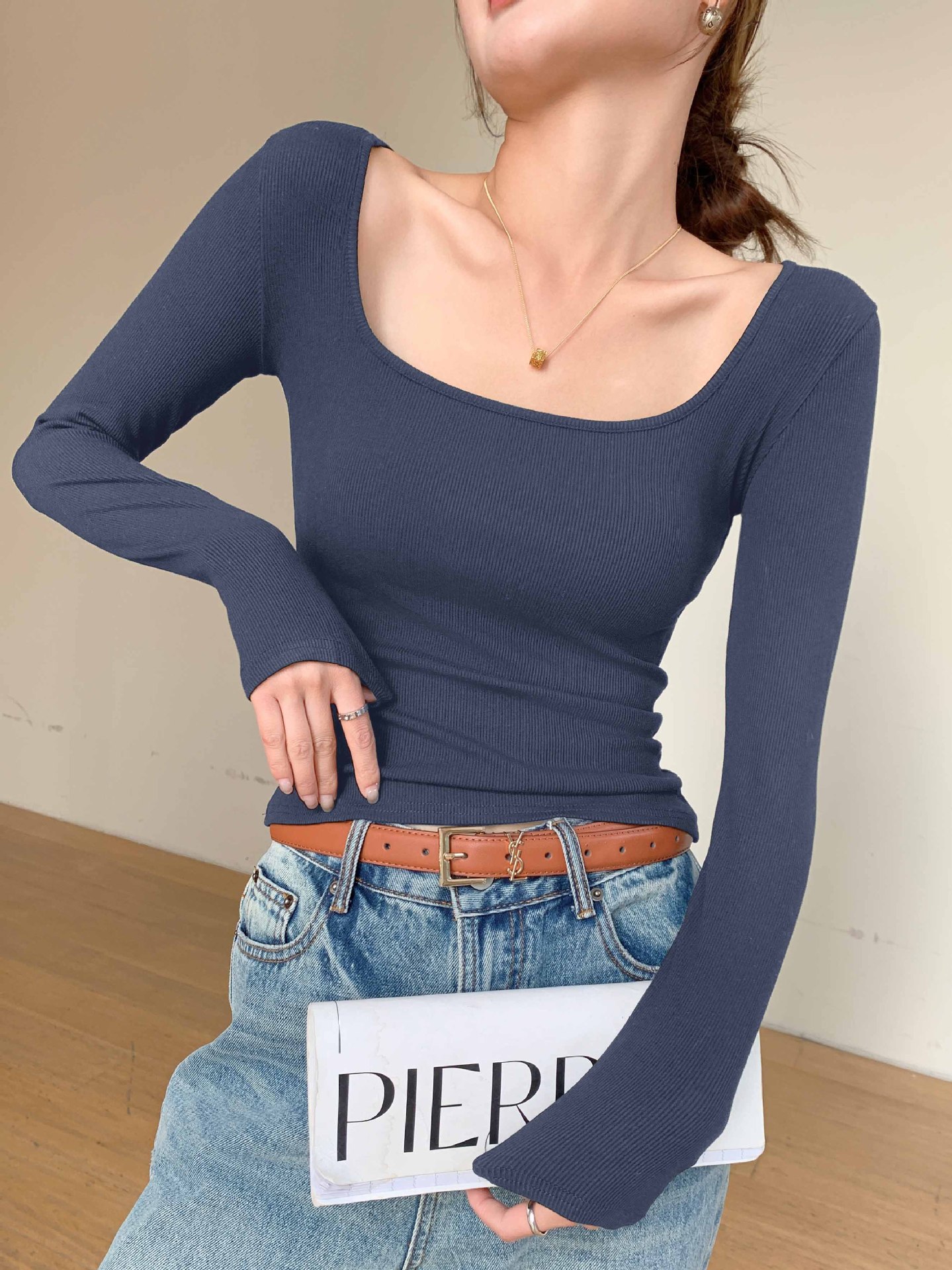 Thread Big U-neck Long-sleeved Top Spring