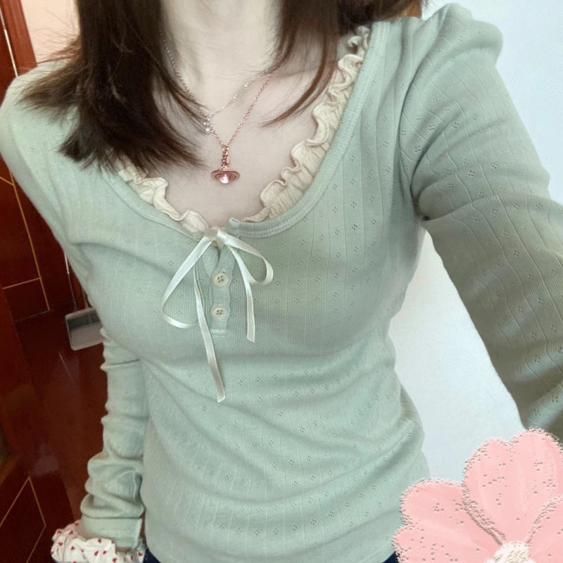 Three-button Eyelet Long-sleeved T-shirt Two-piece Set
