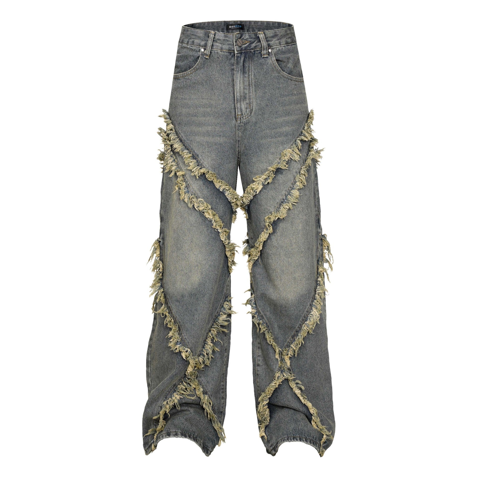 Vintage Patchwork Distressed Wide-Leg Jeans – Y2K Streetwear Denim Wash Distressed Stitching Jeans With Whiskers Same Style For Men And Women